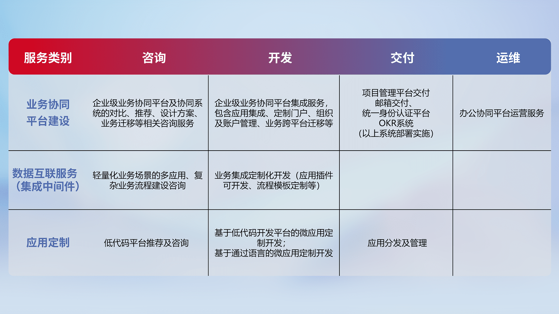 针对钉钉、、企微、、IDaas等平台级产品提供产品的规划、、、方案、、、交付、、、定制化开发等服务,,,,实现如统一协同办公、、、智能客户服务、、、混合会议管理、、、智能数据查询、、、、等业务场景,,,实现数字化转型。。